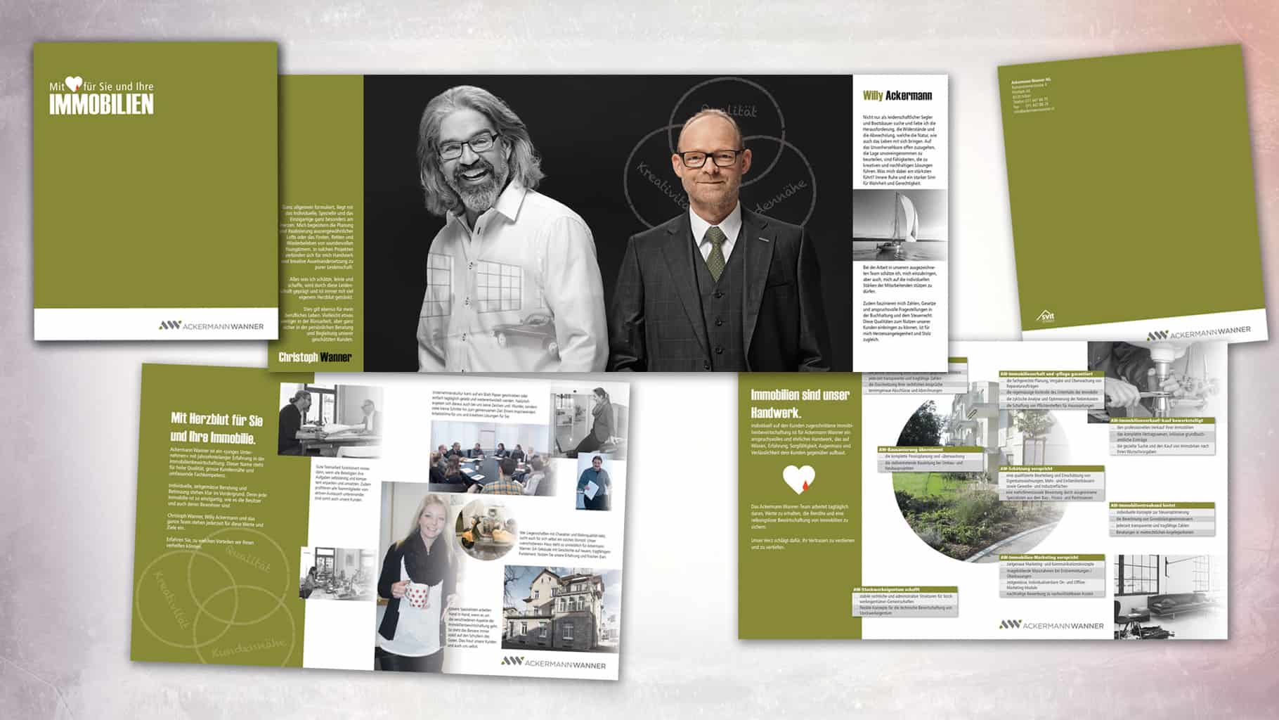Die Imagebroschüre von Ackermann Wanner stellt somit zunächst die Gründer persönlich vor und leitet zu den Werten und Qualitäten des Team mit jahrzehntelanger Erfahrung in der Immobilienbewirtschaftung über. Die Leistungsübersicht rundet die Vorstellung ab.